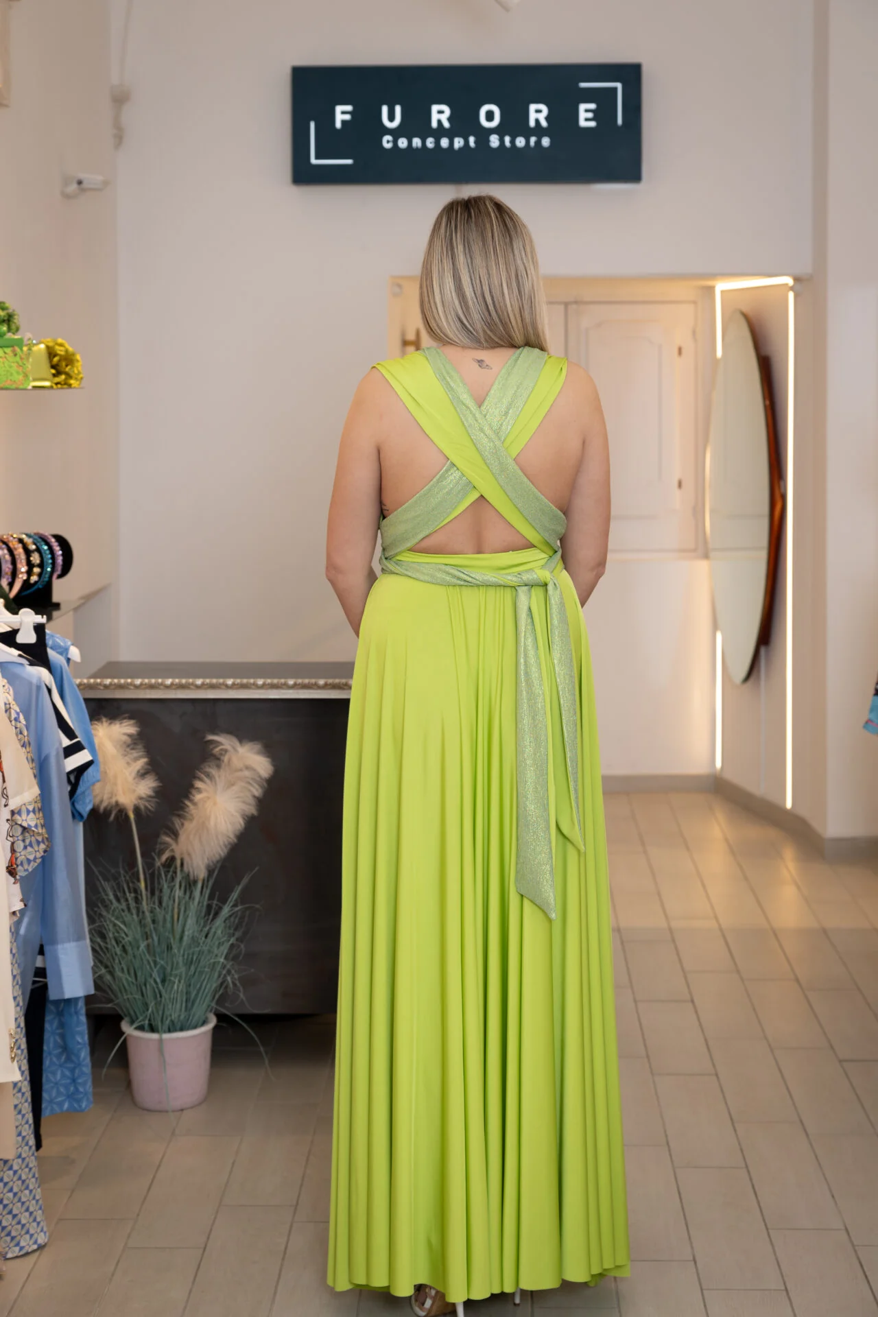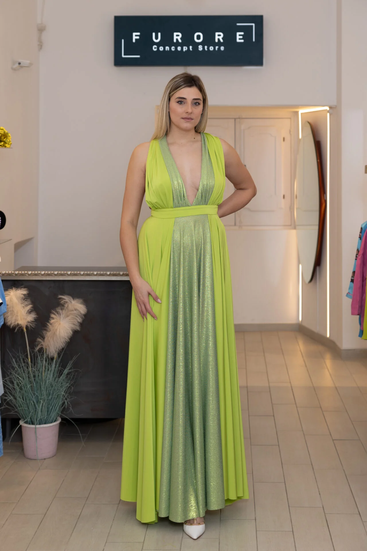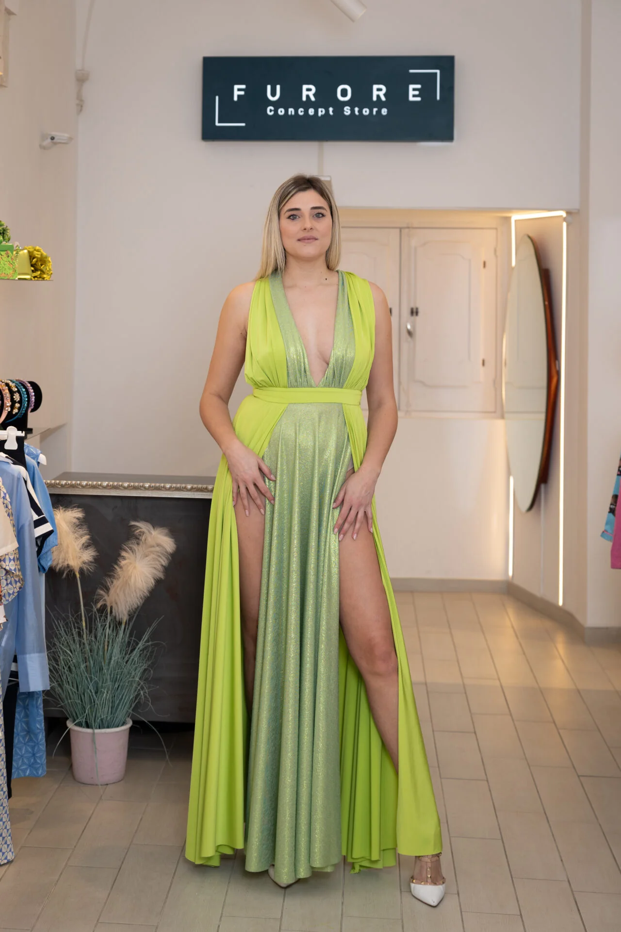 Abito da cerimonia, lungo, ampio in jersey metallizzato. Scollatura a V. Veli regolabili. Spacco laterale. Disponibili nei colori VERDE MELA e LILLA.