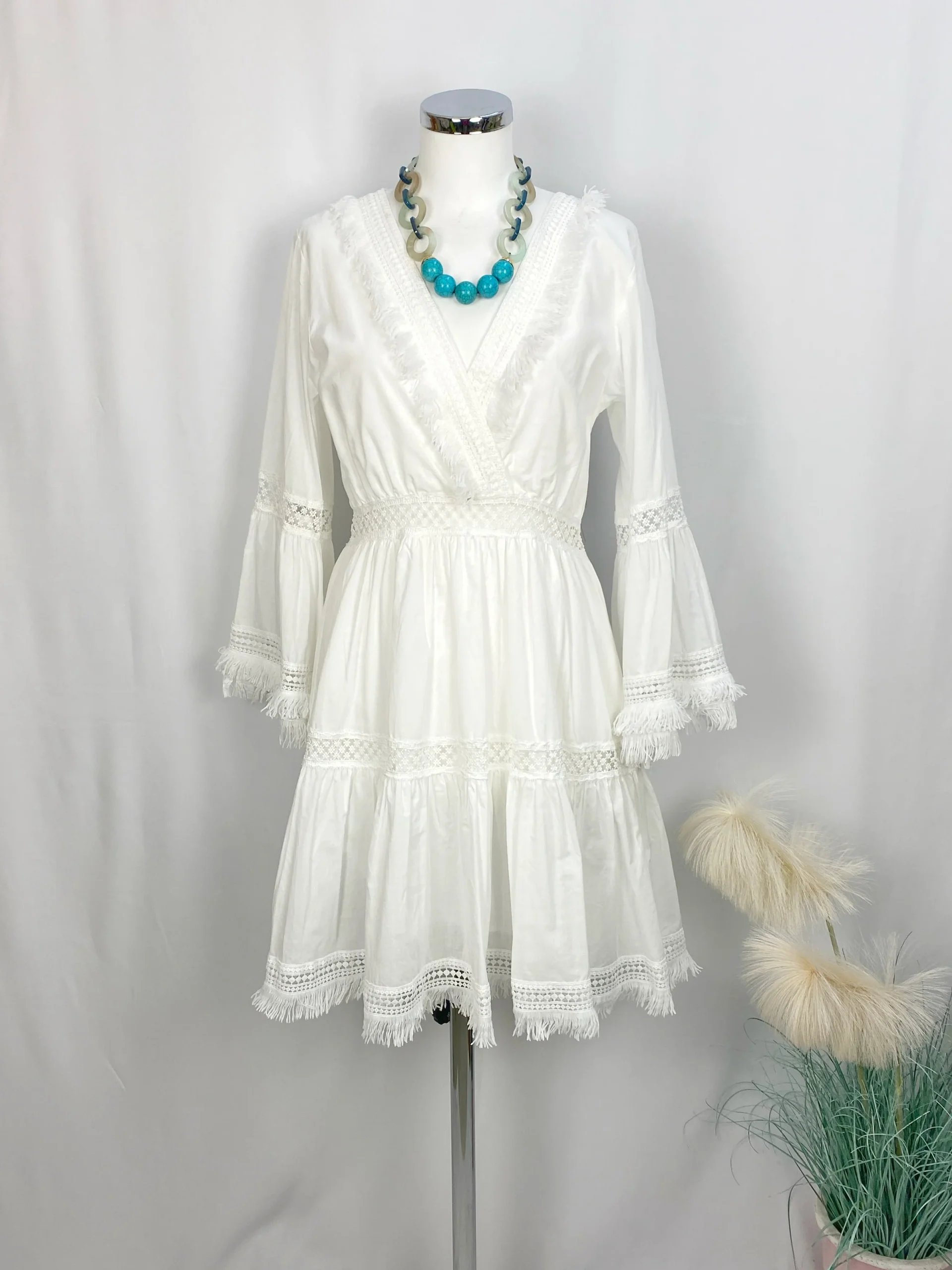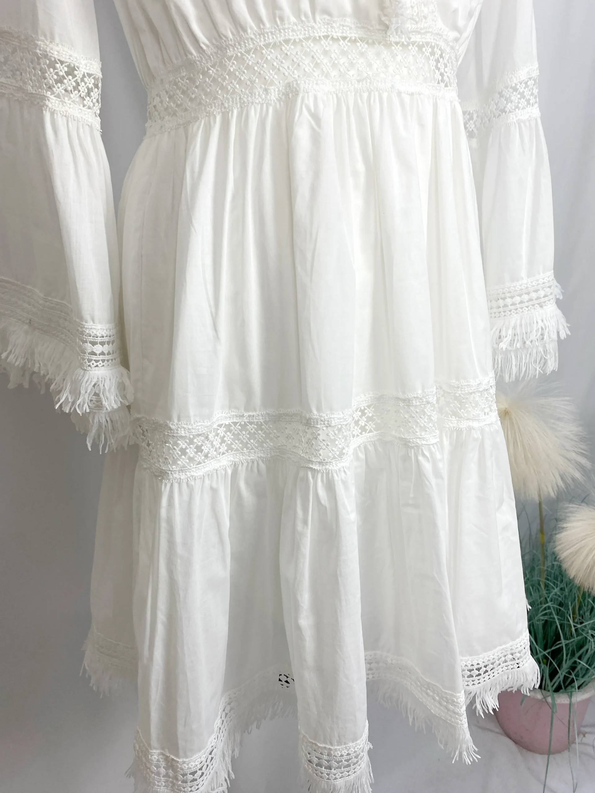 Abito in cotone, manica svasata come la gonna, inserti ricamati con piccole frange; colore BIANCO.