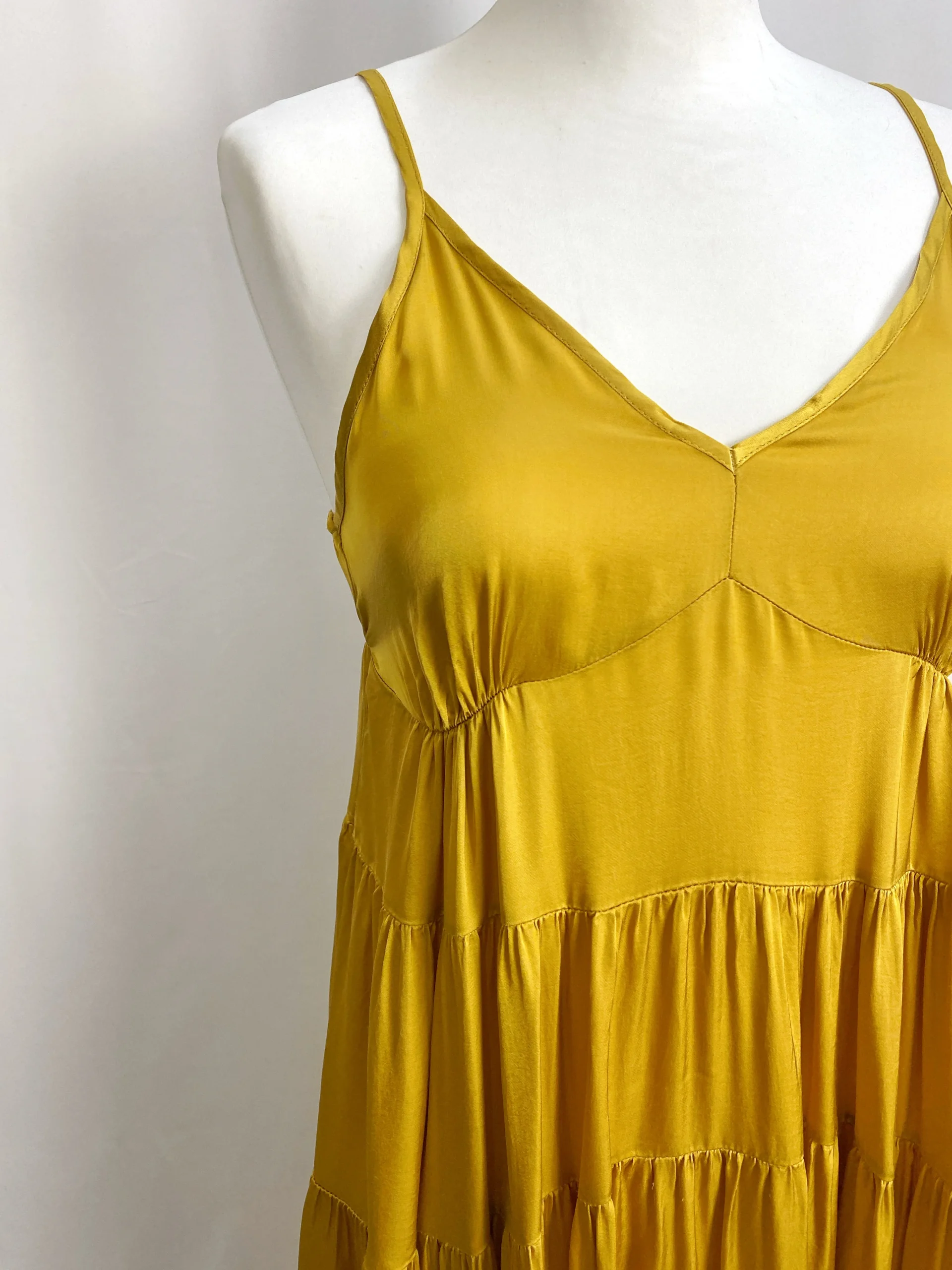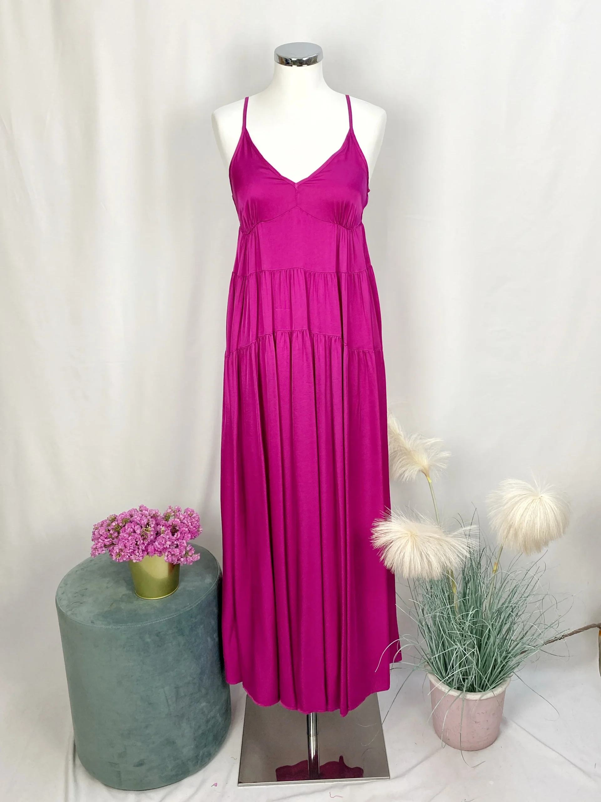 Abito lungo a balze color FUCSIA. Il colore si adatta benissimo ad una stagione cromatica Spring.